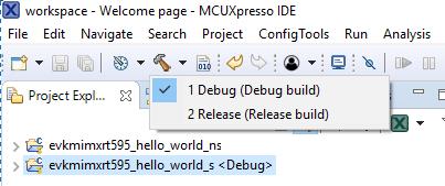 evkmimxrt595\_hello\_world\_sproject (TrustZone master project) in the Project Explorer. Then, choose the appropriate build target, Debug or Release, by clicking the downward facing arrow next to the hammer icon, as shown in Figure 2. For this example, select the Debug target.|