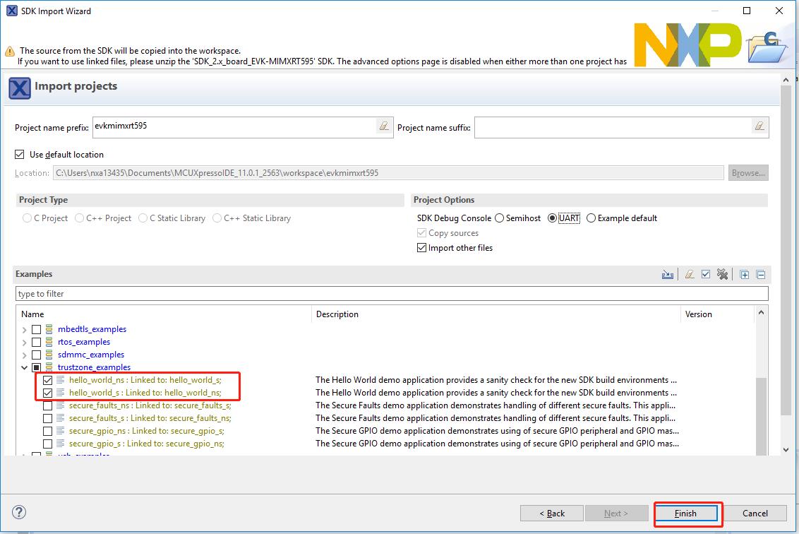trustzone_examples/folder and selecthello_world_s. Because TrustZone examples are linked together, the non-secure project is automatically imported with the secure project, and there is no need to select it explicitly. Then, click Finish.|
