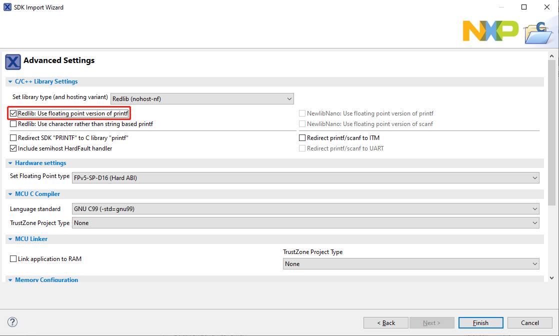 demo_appsfolder and selecthello_world. Then, click Next.Ensure Redlib: Use floating-point version of printf is selected if the example prints floating-point numbers on the terminal. Otherwise, it is not necessary to select this option. Then, click Finish.