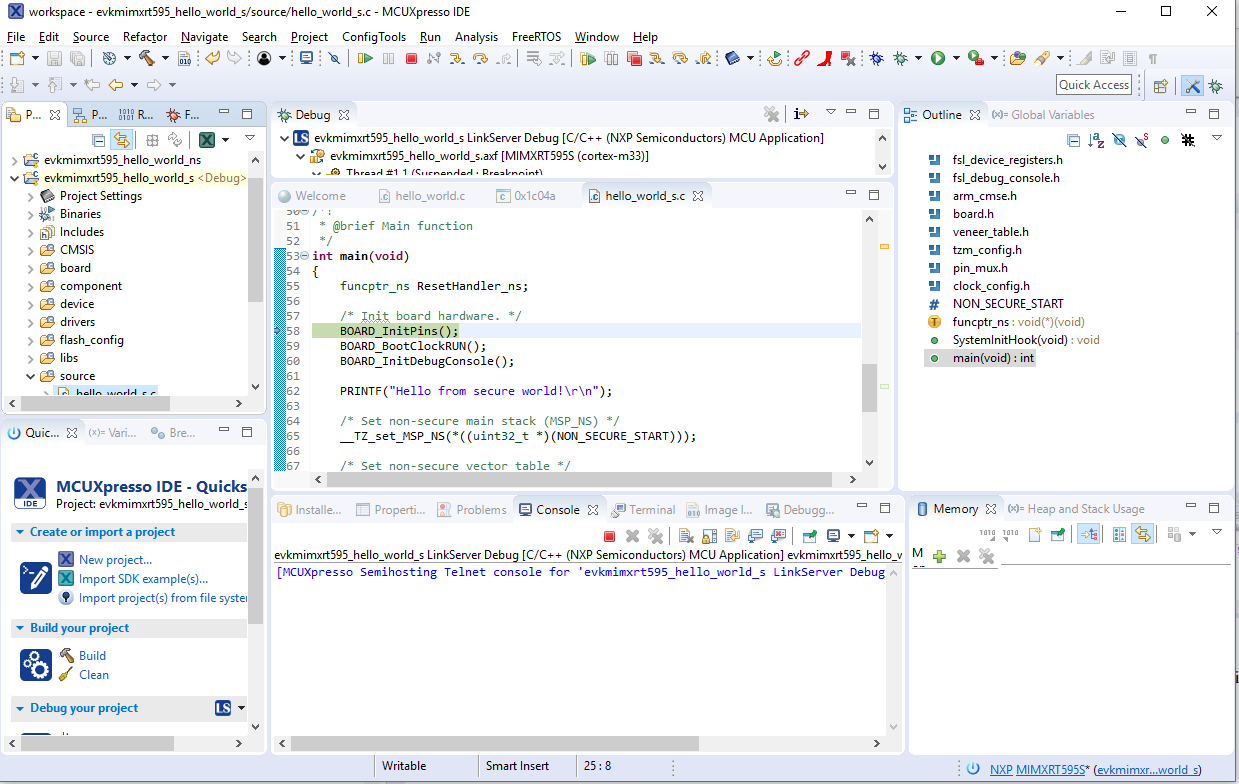 To download and run the application, perform all steps as described in Run an example application. These steps are common for single core, and TrustZone applications, ensuring evkmimxrt595_hello_world_s is selected for debugging.
