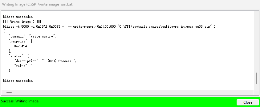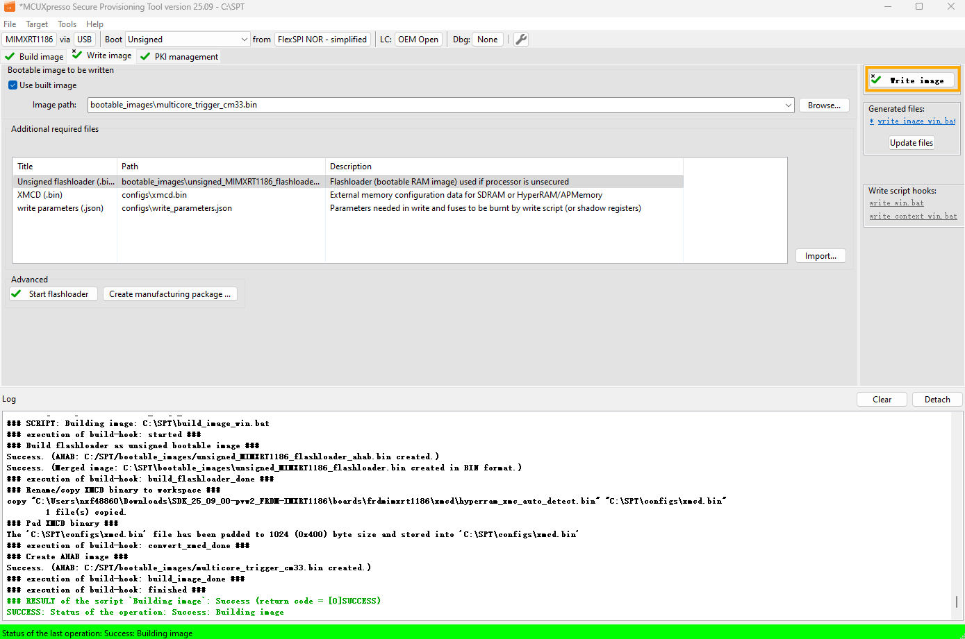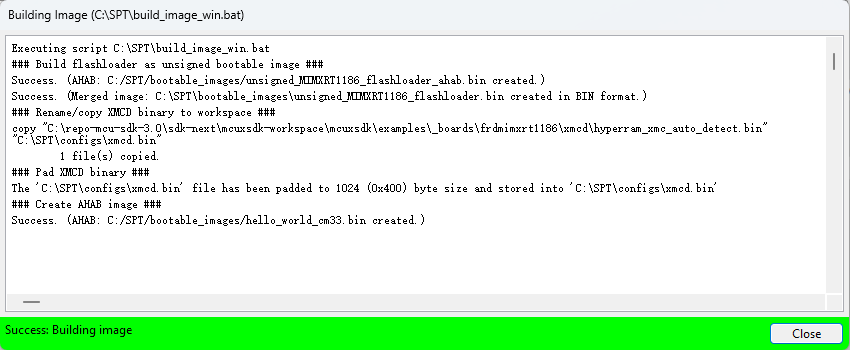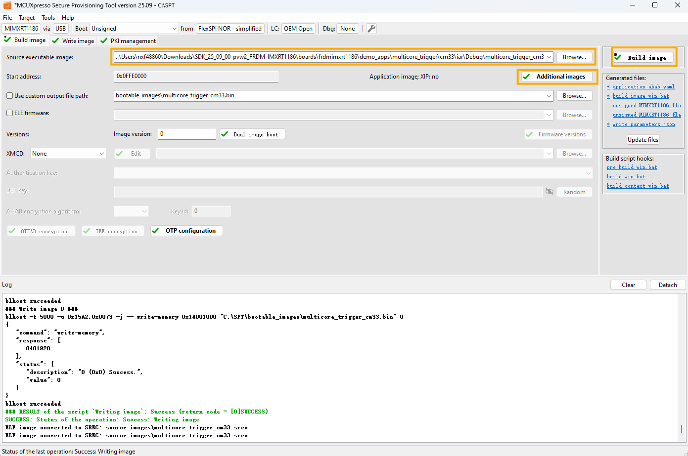 The new image constructed under Build images is still not a complete image, and the Memory Configuration Block is missing. When writing image, SPT downloads the contents of the Memory Configuration Block to FLASH.