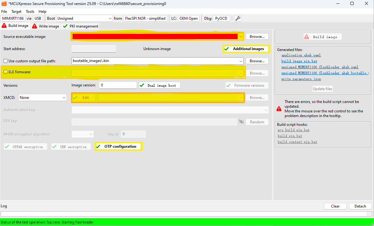 Now switch to the Write Image tab. All information is automatically generated from the previous page. Connect both USB OTG1 port (J63) and MCU-Link port (J23) to the computer and power up the board (or reset via SW2). Make sure that the FRDM board boot configuration switch J60[1..3] are on 100 SDP mode and click Write Image.