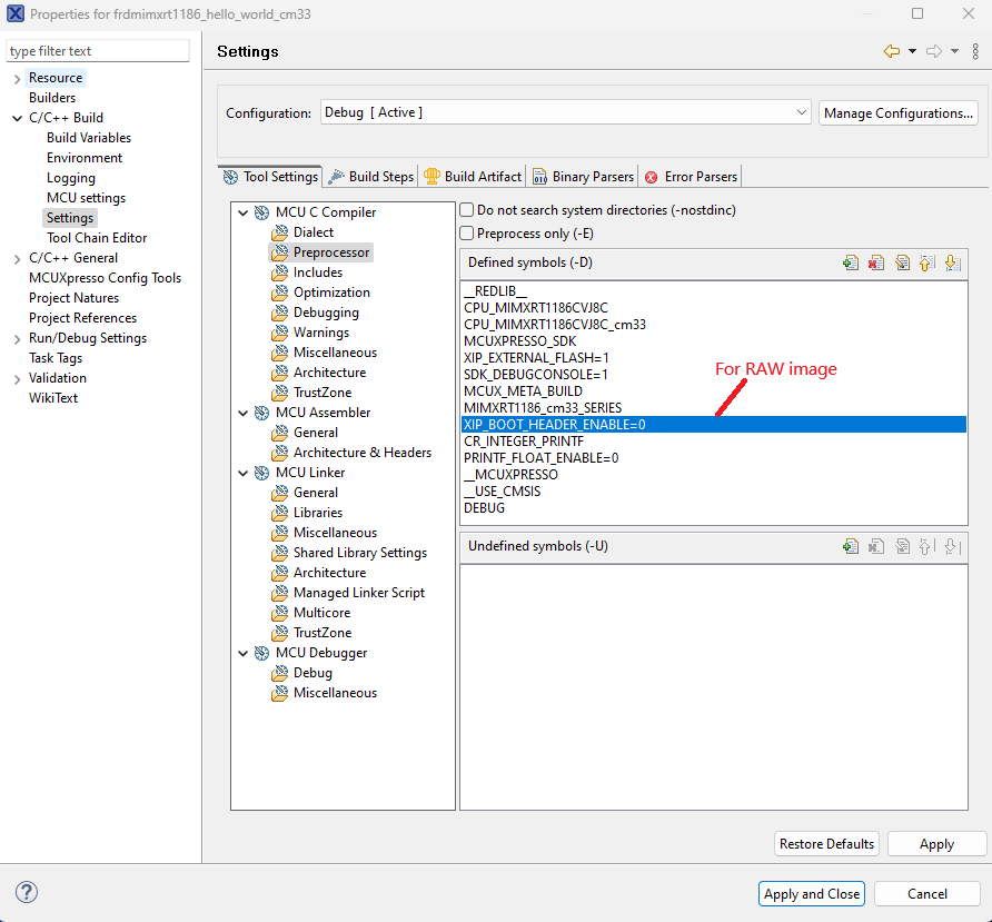 MCUxpresso settings for image type switch#