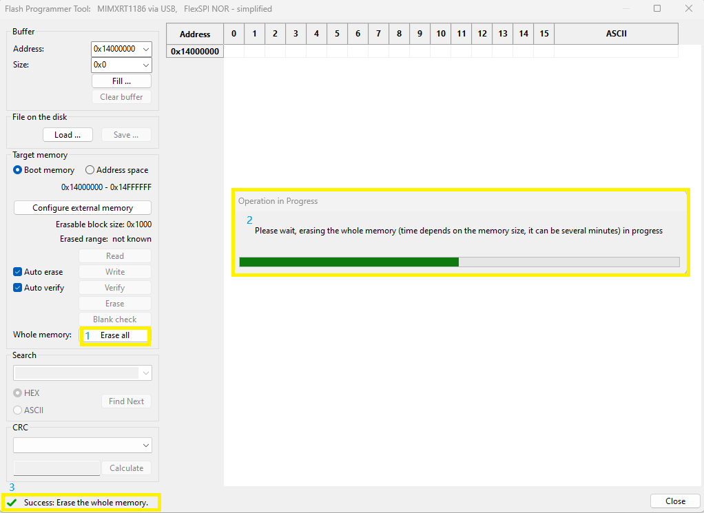 Success: Erase whole memoryshows up, the board should have restored to a good state to work in various mode.