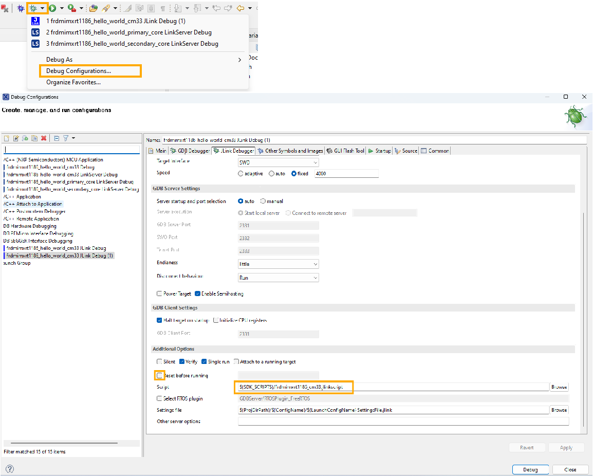 If you investigate on debug configurations, you will notice two settings, which are different from CMSIS-DAP debugging. The Reset before running is unchecked, and a jlinkscript is specified. This is because of the difference in CMSIS-DAP and JLink debugging implementation. The differences are pre-configured by MCUX default project settings.