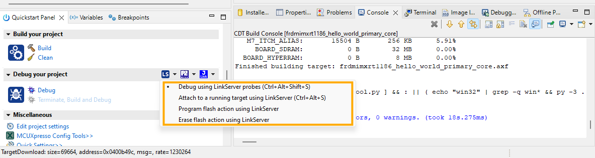 Note: Erase the flash memory before running the MCUX IDE projects for the first time. To do so, use the Erase Flash action using LinkServer in Figure 2 with
