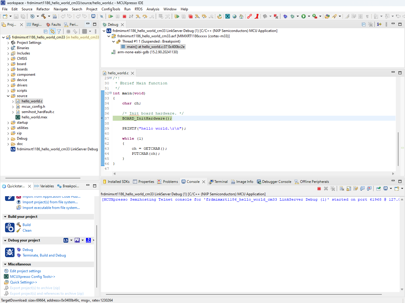 This section describes the steps required to configure MCUXpresso IDE to build, run, and debug example applications. The hello_world demo application targeted for the FRDM-IMXRT1186 hardware platform is used as an example, through these steps can be applied to any example application in the MCUXpresso SDK.