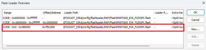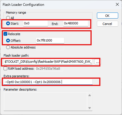 Set the memory range, relocate offset, and flashloader path.