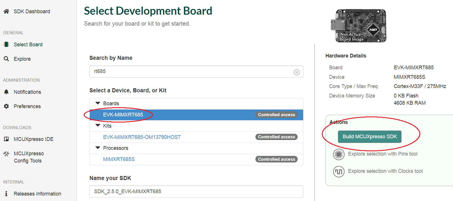 1. In the Build SDK for EVK-MIMXRT685 page, select the required environment settings.