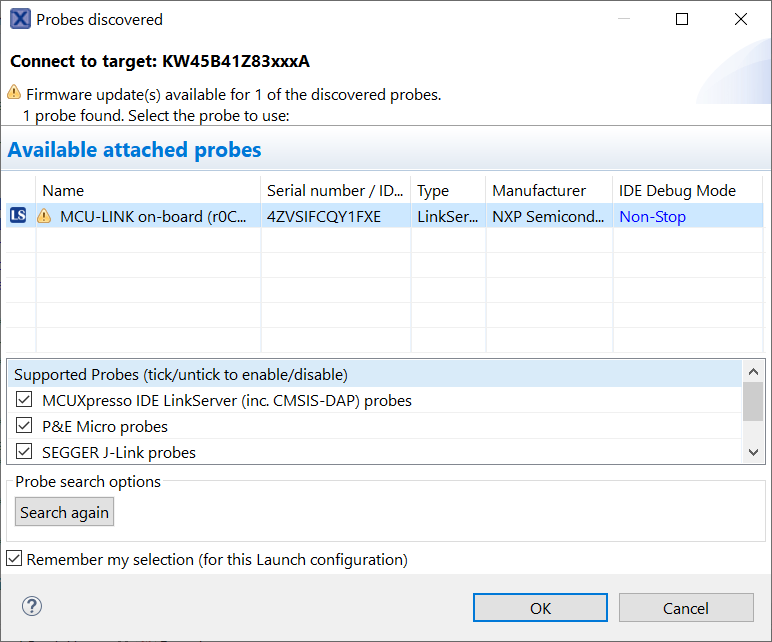 4. The first time you debug a project, the Debug Emulator Selection dialog is displayed, showing all supported probes that are attached to your computer. Select the probe through which you want to debug and click OK. (For any future debug sessions, the stored probe selection is automatically used, unless the probe cannot be found.)