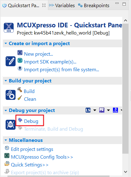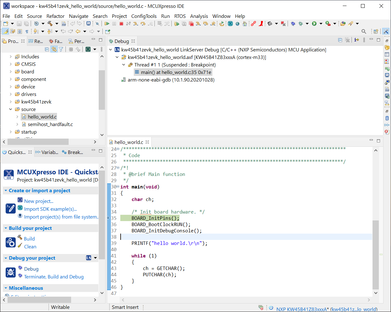 This section describes the steps required to configure MCUXpresso IDE to build, run, and debug example applications. The hello_world demo application targeted for the KW45B41Z-EVK hardware platform is used as an example, though these steps can be applied to any example application in the MCUXpresso SDK.
