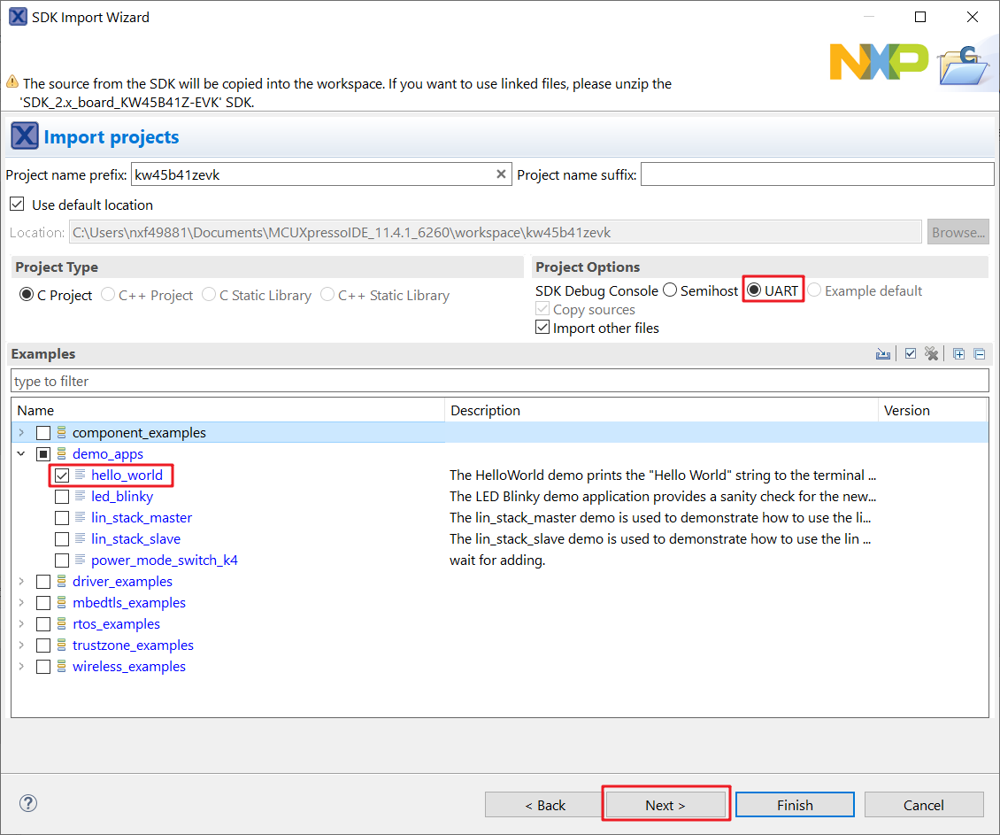 4. Expand the demo_apps folder and select hello_world. Then, click Next.