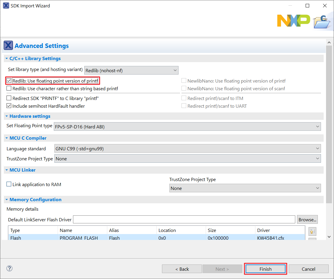 5. Ensure Redlib: Use floating point version of printf is selected if the example prints floating point numbers on the terminalfor demo applications such as adc_basic, adc_burst, adc_dma, and adc_interrupt. Otherwise, it is not necessary to select this option. Then, click Finish.