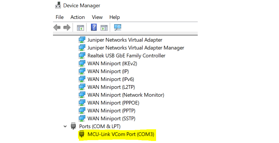 2. Verify which COM port is assigned to your KW47-EVK board. To check the assigned COM port, in the Windows Device Manager program, search for Ports (COM & LPT) and save the COM port number. In this example, the assigned COM port is COM3.