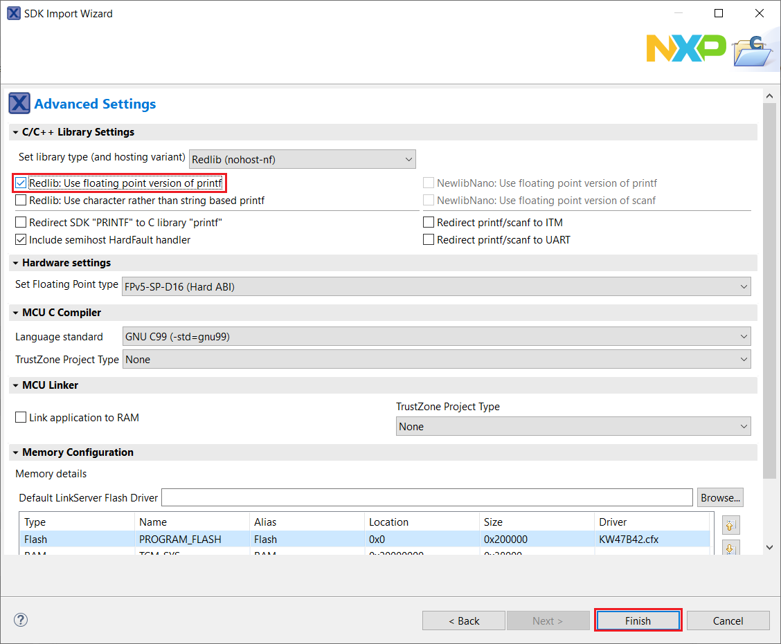 Ensure Redlib: Use floating point version of printf is selected if the example prints floating point numbers on the terminal for demo applications such as
