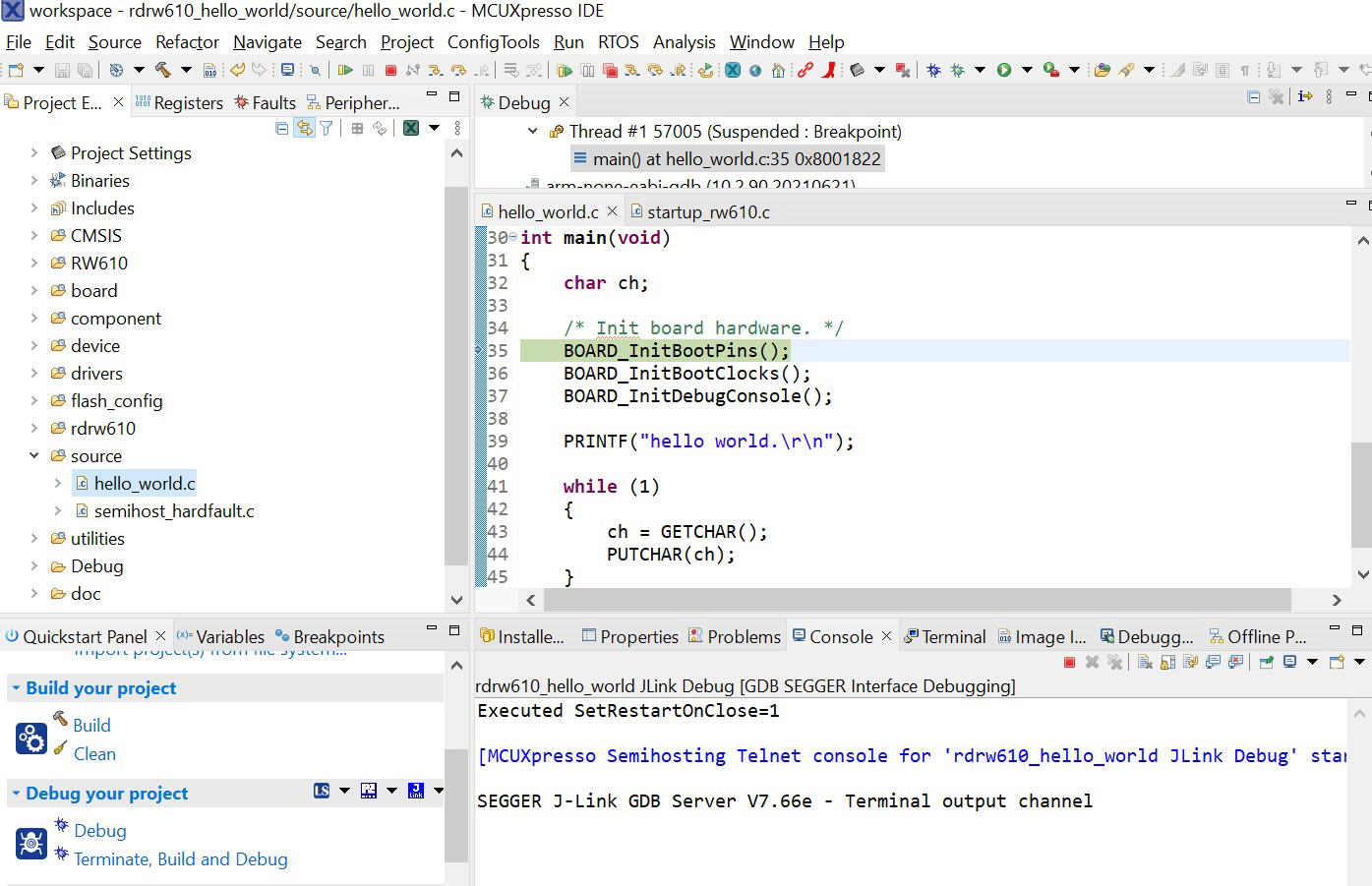 1. On the Quickstart Panel, click on Debug rdrw610_hello_world [Debug] to launch the debug session.