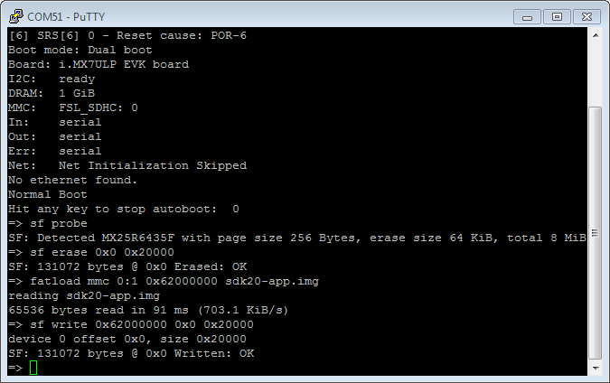 Power on the board and hit any key to stop autoboot in the terminals, then enter to U-Boot command-line mode. You can then write the image and run it from QSPI Flash with the following commands (Assume that image size is less than 0x20000, otherwise the sf erase and write command size parameter must be enlarged. If the image size is bigger than 0x20000 (128 kB), change 0x20000 to a number larger or equal to the image size.):
