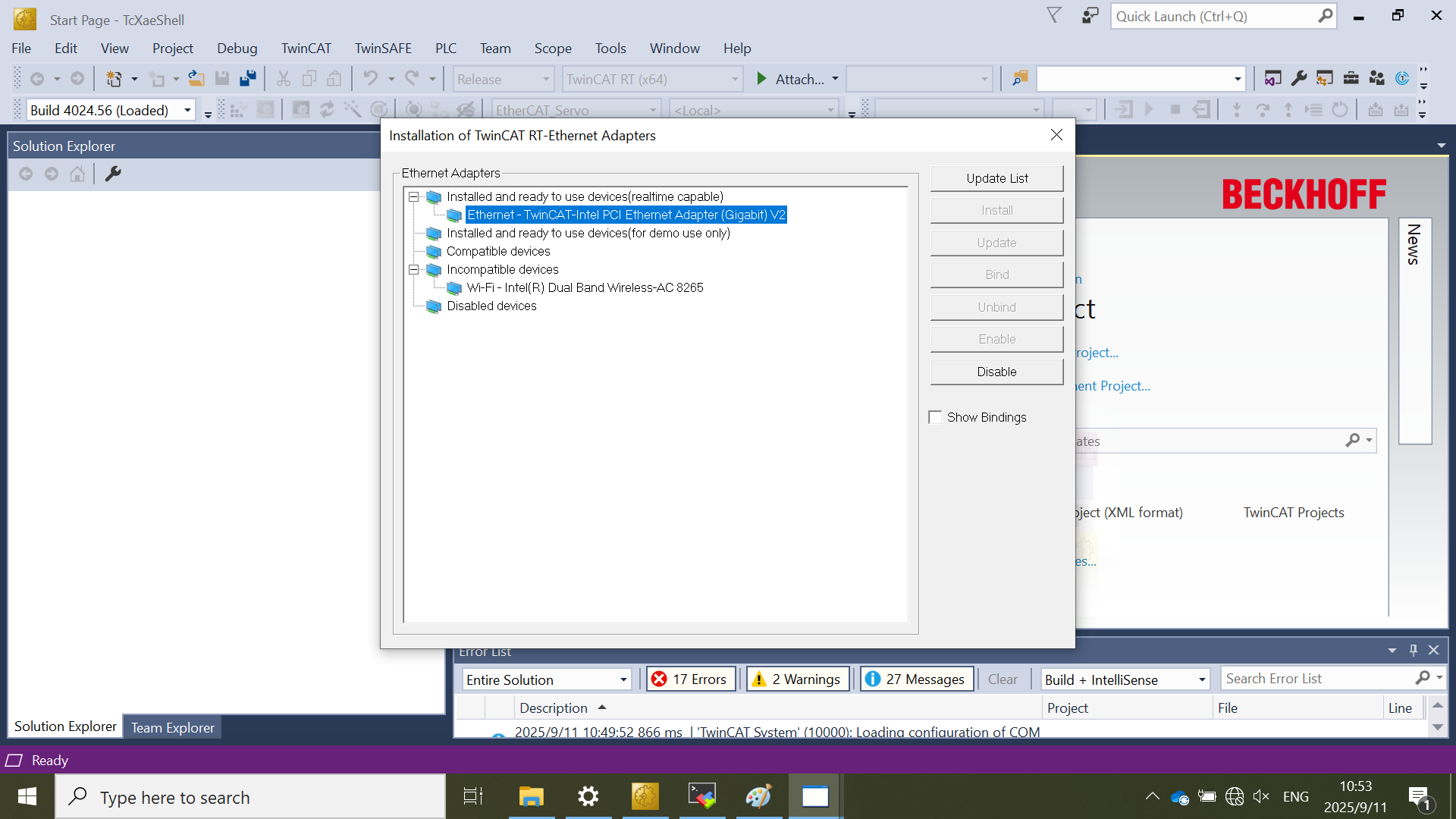 TwinCAT requires the realtime ethernet support. The steps is as below:Click TwinCAT > Show Realtime Ethernet Compatible Devices.