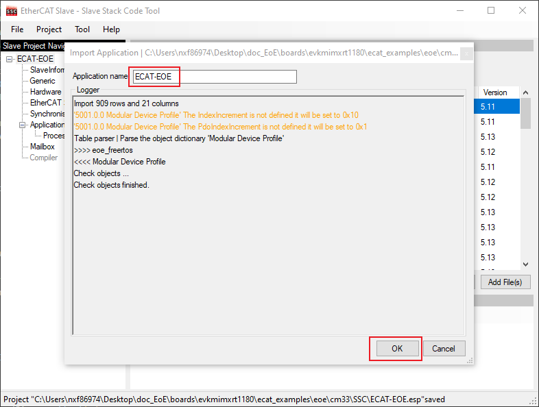 Create the EoE example application via importing the eoe_freertos.xlsx file.