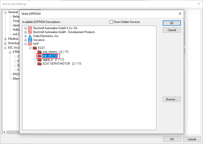6. From the available EEPROM list, select NXP > ECAT > foe.