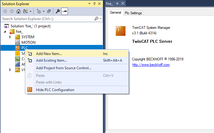 1. In the Solution Explorer view, right-click on PLC.