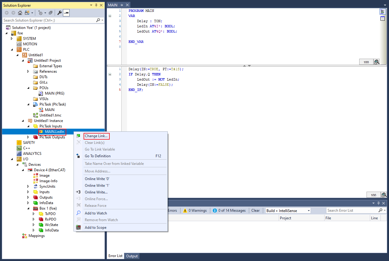 4. In the Solution Explorer, under PlcTask Outputs, right-click on MAIN.LedOut and select Change Link.