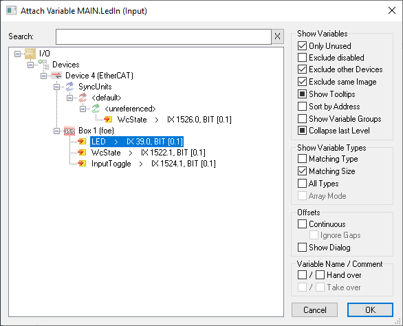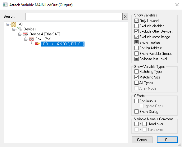 The Attach Variable MAIN.LedOut (Output) dialog box appears.