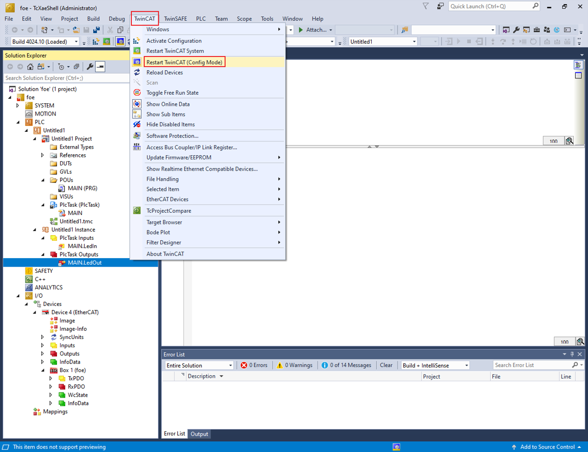 1. To activate the configuration, select TwinCAT > Restart TwinCAT (Config Mode).
