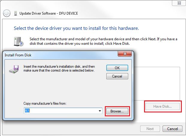 Step 4.Select “Have Disk” and then “Browse” Navigate to your DFU driver location.