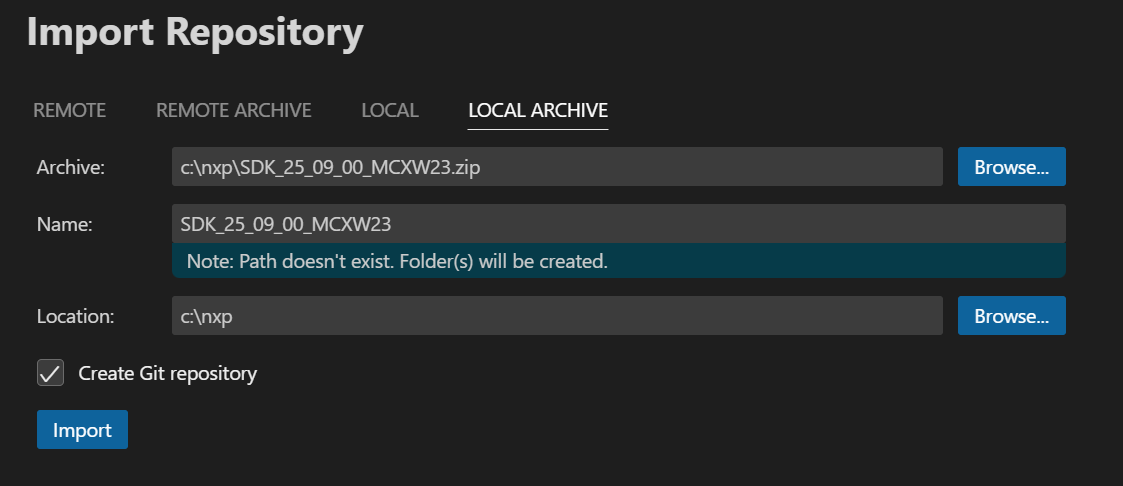 Else if the SDK is ZIP archive, select Local Archive, browse to the downloaded SDK ZIP file, fill the link of expect location, then click Import.