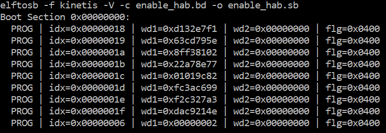 After the command “program_flexspinor_image_hyperflash_encrypt.bd -o boot_image.sb ivt_flexspi_nor_xip_signed_nopadding.bin” in the figure above , a file named “boot_image.sb” is generated in the folder that contains the elftosb utility executable.
