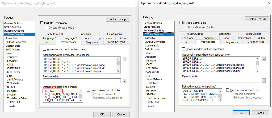 2.  Change the include directories in the project settings, by clicking **Option** \> **C/C++ compiler** \> **Preprocessor**, according to the changes of project files.