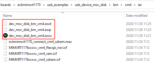 4.  For RT1170, open the `dev_msc_disk_bm_cm4.eww` and `dev_msc_disk_bm_cm4.ewp` files with a text editor, such as notepad, notepad++, sublime or Visual studio code.