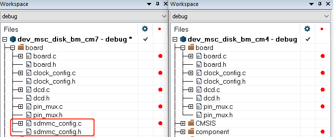 -   For the `drivers` group, delete `fsl_pit` source files from the `cm4` project and add `fsl_usdhc` source files to the `cm4` project.