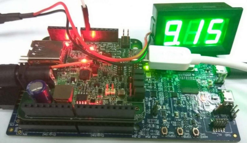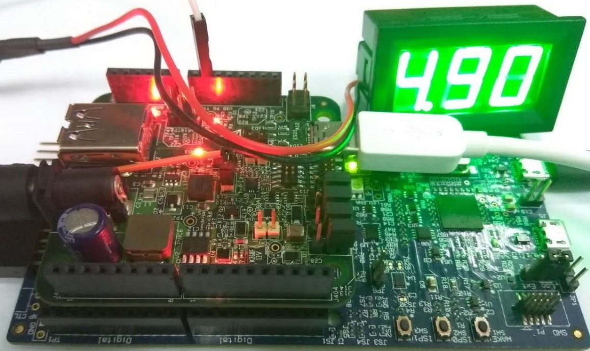 Connect a voltmeter to VBus (J5) of the sink role board. The voltmeter at the sink role shows approximately 5 V.