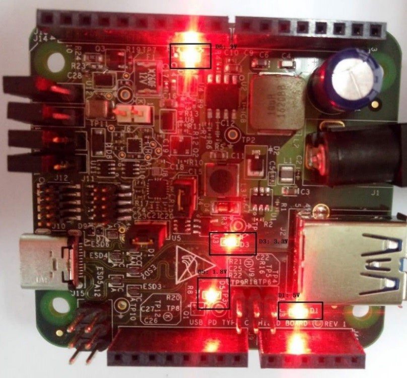 Connect a 9 V power source to the J1 jack in the USB-PD/Type C Shield board. The shield LEDs status is as follows: