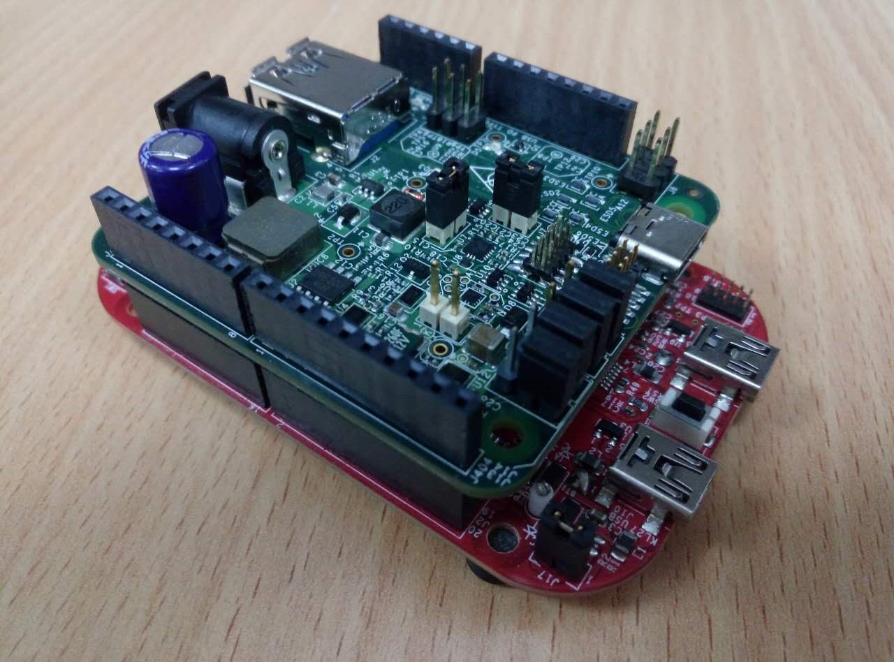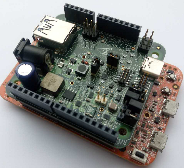 Note: Before powering up, verify the USB Type-C shield is pushed all the way into the Arduino header with good contact. Make sure there are no unintentional shorts (like jumper, blue wires) between the USB Type-C Shield board and the main development board.