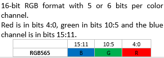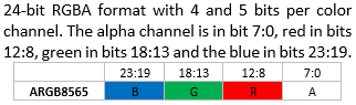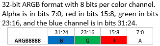 Attention: OpenVG VGImageFormat Note: The bits for each color channel are stored within a machine word from MSB to LSB in the order indicated by the pixel format name. This is the opposite of the original VG_LITE_* formats that are ordered from LSB to MSB. The formats with the same organization are listed in the same row as their VG_Lite counterparts.