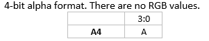 The following codes, as also used in OpenVG 1.1 Specification Table 11, are used for format description: