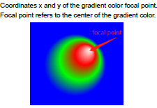 The radial gradient parameters are supplied as a vector of 5 floats. Parameters (cx, cy) specify the center point, parameters (fx, fy) specify the focal point, and r specifies the radius. See structure vg_lite_radial_gradient_parameter_t. |
