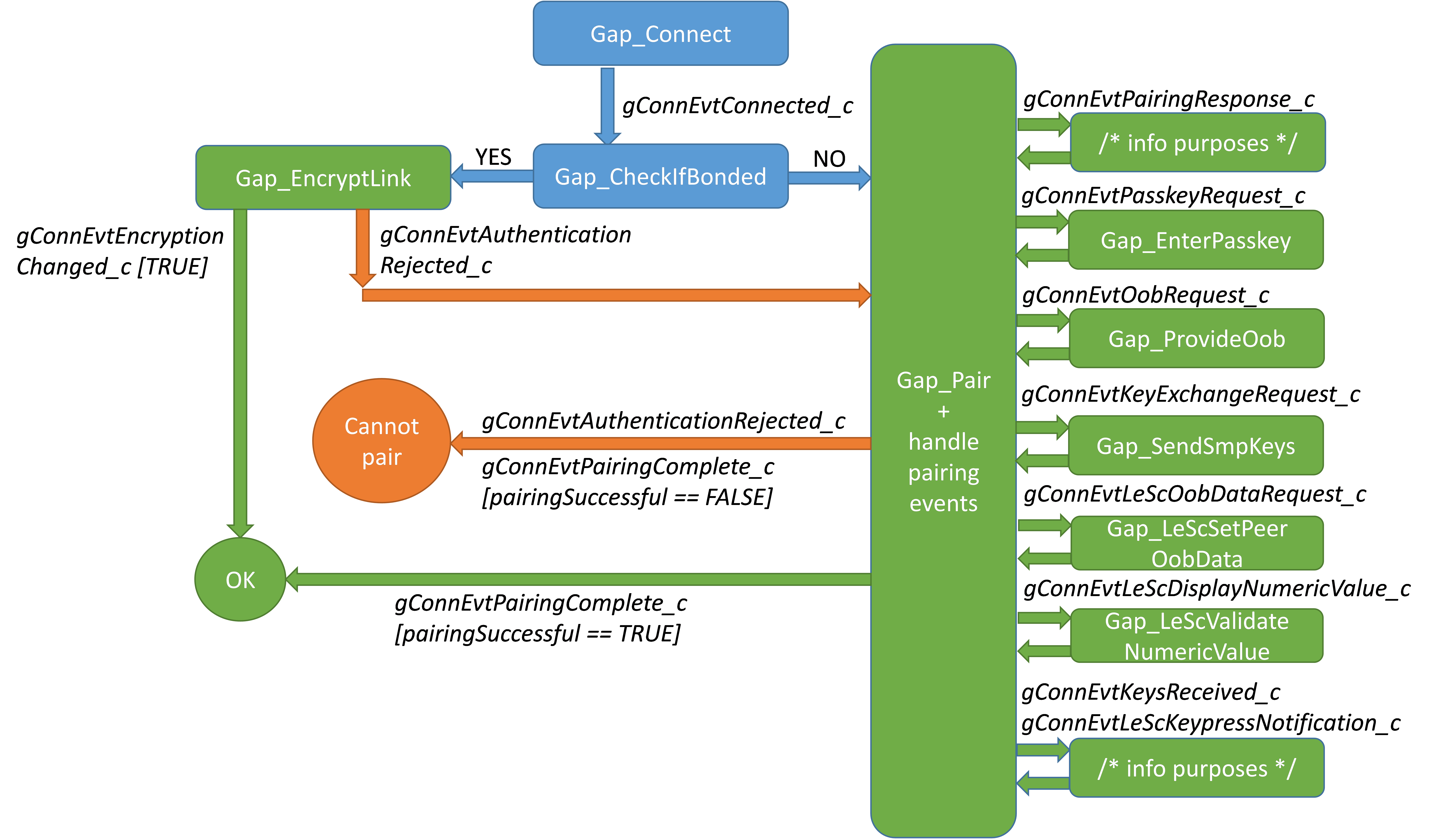 If the devices are not bonded, the Peripheral should expect to receive the gConnEvtPairingRequest_c, indicating that the Central has initiated pairing.