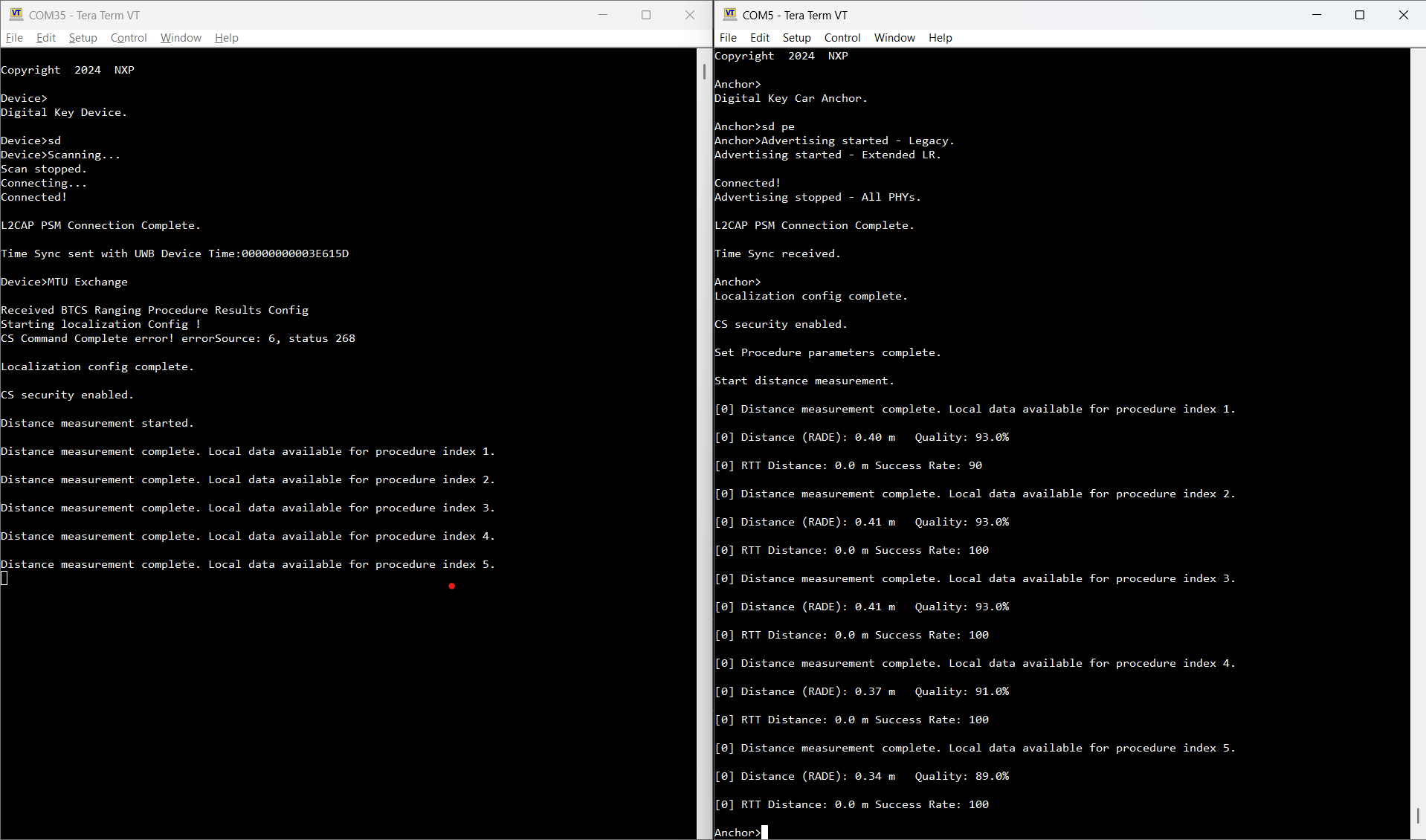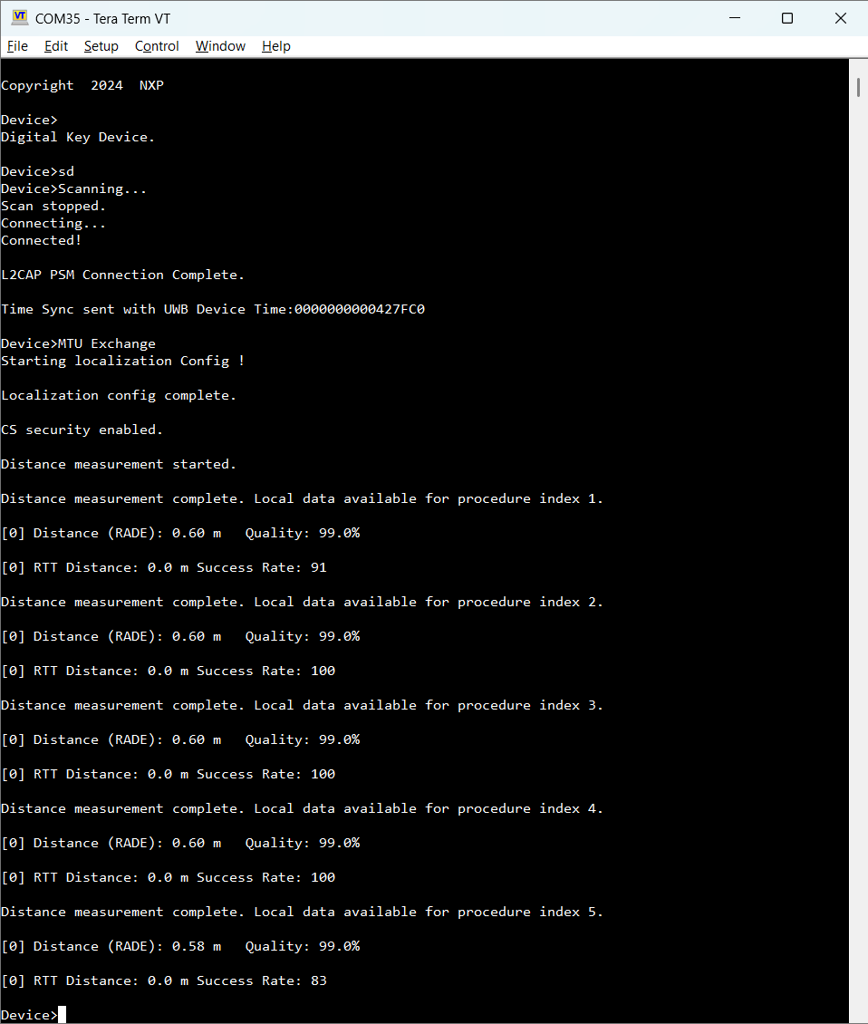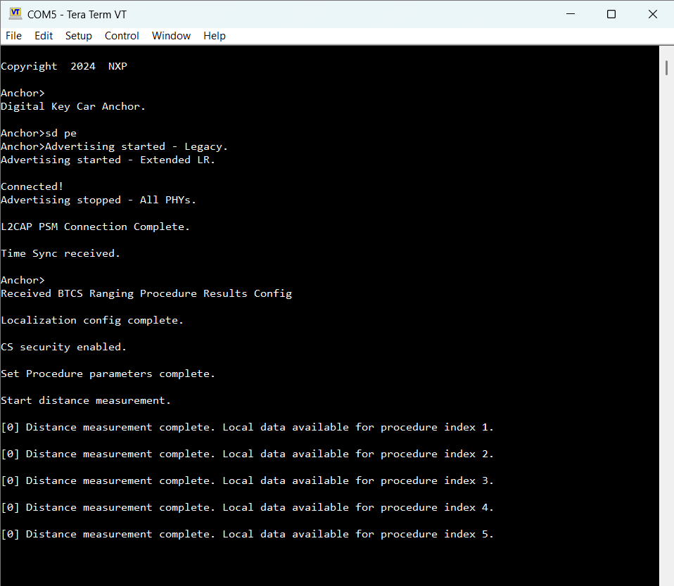 The localization process starts automatically after the Passive Entry scenario is completed. The CS Initiator performs the CS setup and starts a number of gCsProcRepeatMaxNumProcedures_c procedures. After each procedure, the Device’s local data is transmitted through BTCS to the Anchor. After the Anchor collects the data, it runs the selected algorithm(s) and displays the measured distance (meters) in the console.