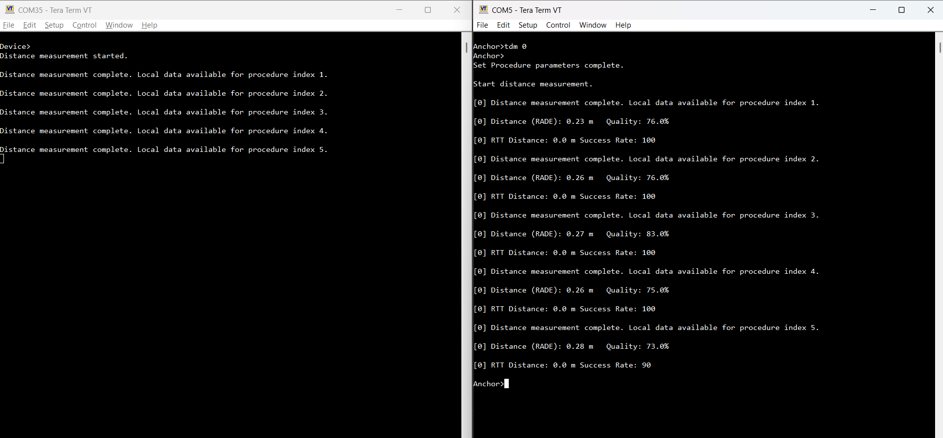 Localization can also be performed on demand via the tdm shell command, which takes the device ID of the peer as an argument. The command must be executed on the device that is configured as CS Initiator. As shown in the figure below, the Device triggers the localization process, and the default 5 measurements complete successfully.