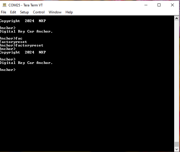 The first step is to run the “factoryreset” command on both boards in order to ensure no previous bonding data is present in non-volatile memory. Refer to the figure below.
