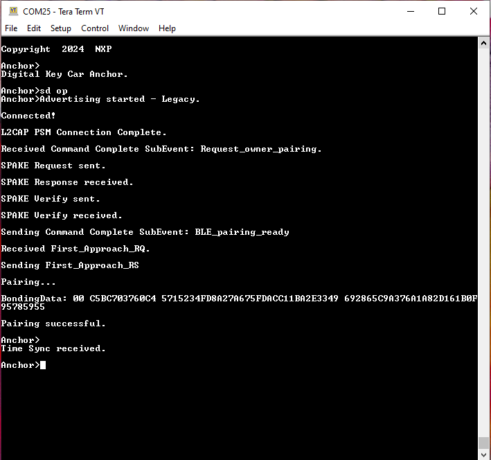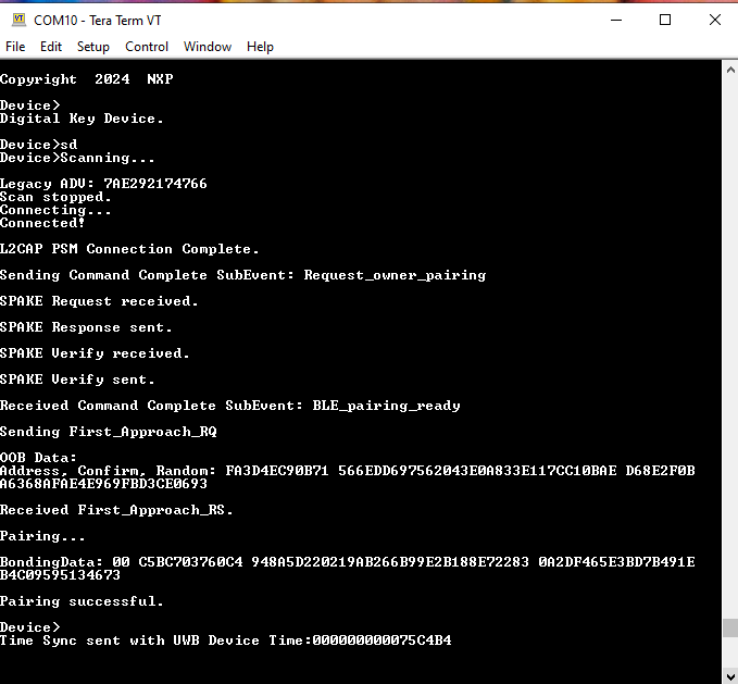 The next step is to run the “sd” command (Start Discovery) on the Device and the “sd op” command on the Car Anchor (Owner Pairing advertising differs from Passive Entry, using a single Legacy advertising set on the 1M PHY). The Car Anchor starts advertising while the Device scans. Since both boards have been factory reset, they follow the Owner Pairing flow. The command outputs are shown in the below figures.