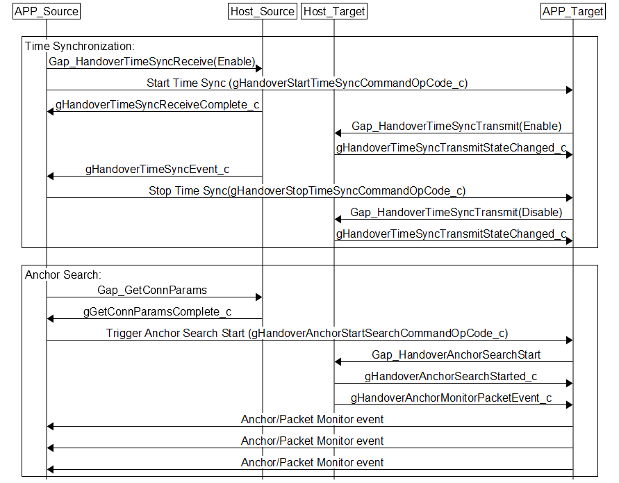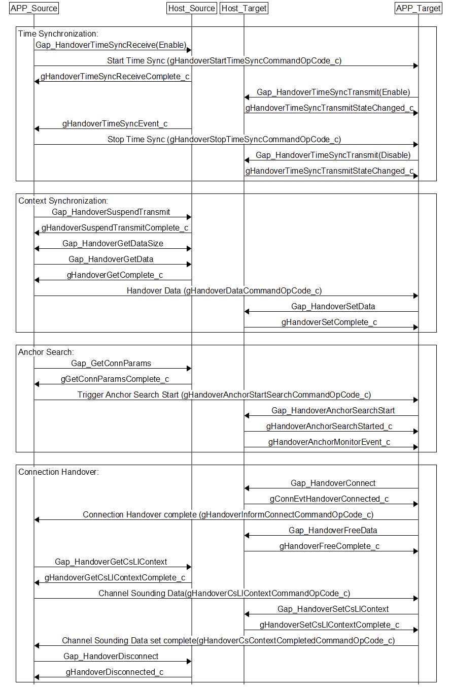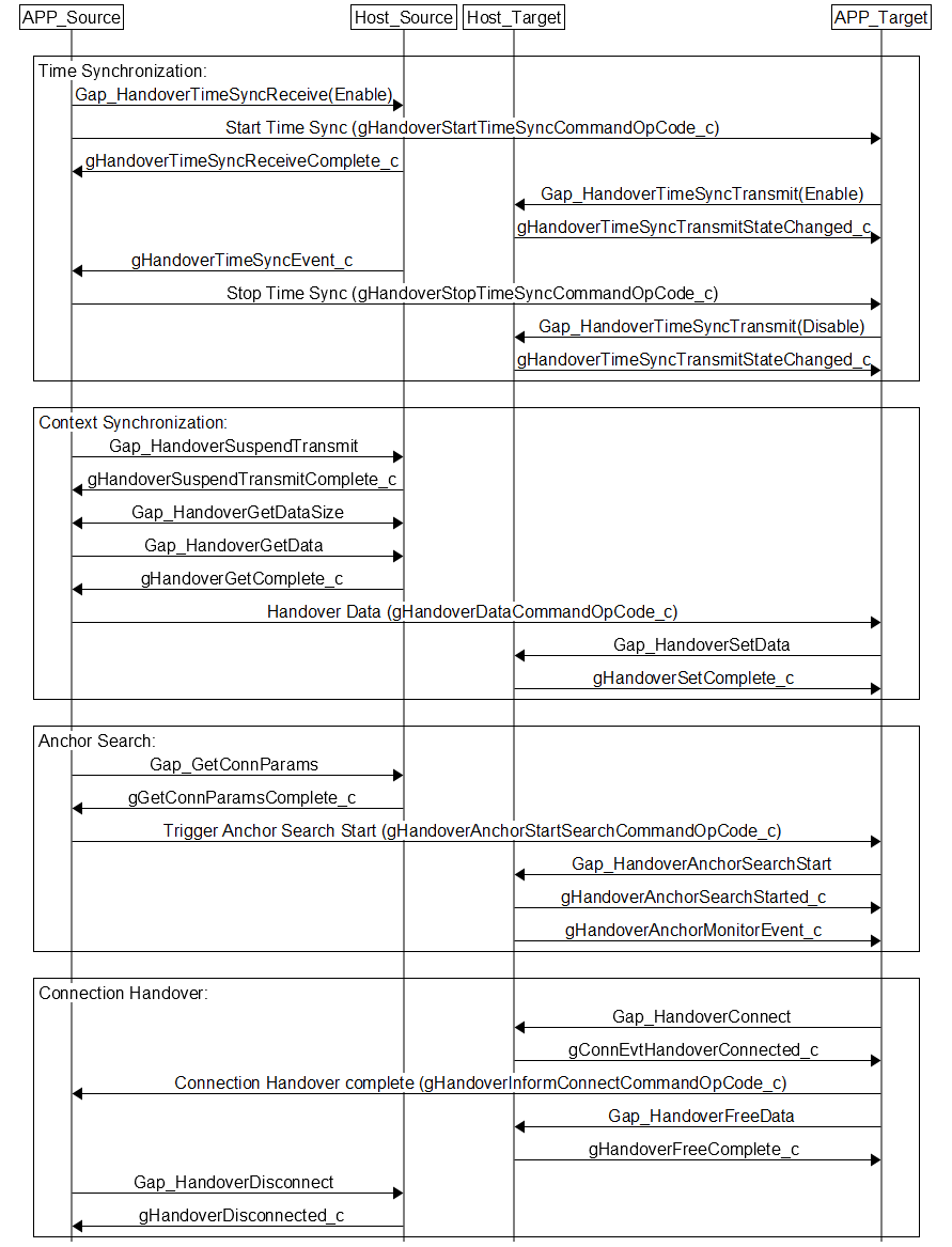 GAP_HandoverTimeSyncTransmit()Source device receives the ‘gHandoverTimeSyncReceiveComplete_c’ event indicating that Source Link Layer is waiting for the time synchronization event.