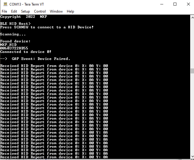 To start scanning for devices, press the SCANSW button on the HID Host board. To make it enter discoverable mode, perform the same step on the HID device board. The host connects with the board after it sees it advertise the HID service, connects to it, and configures report notifications. The device then starts sending HID reports, as shown in Figure.