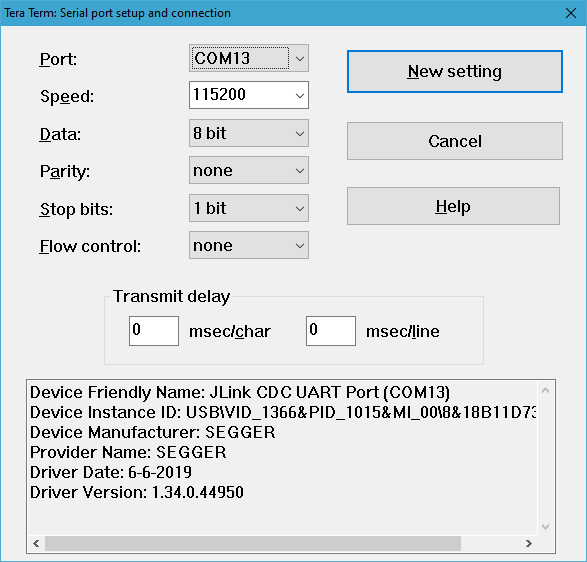 Wireless ranging application can be used either by using a console or by using a Python script environment. To use the console, connect to each device COM port with Tera Term using the setup (putty is not supported), as shown in the figure below.