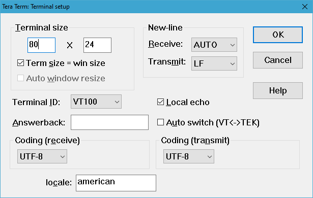 Figure: Tera Term configuration for operating with wireless ranging