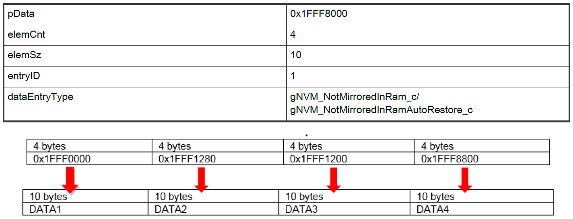 The active page contains information about the records and the records. The storage system can save individual elements of a table entry or the entire table entry. Unmirrored datasets can only have individual saves. On mirrored datasets, the save/restore functions must receive the pointer to RAM data. For example, if the application must save the third element in the above vector, it should send 0x1FFF8000 + 2 * elemSz. For unmirrored datasets, the application must send the pointer that points to the area where the data is located. For example, if the application must save the third element in the above vector, it should send 0x1FFF8000 + 2 * sizeof(void*).